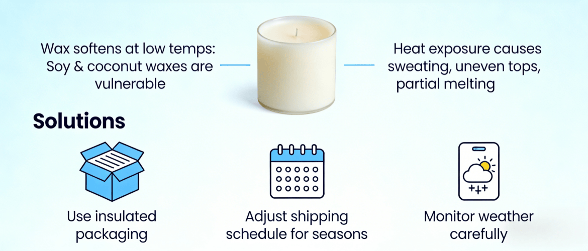 Wax softens at relatively low temperatures. Soy and coconut waxes are especially vulnerable. Heat exposure during shipping can cause candles to sweat, develop uneven tops, or even partially melt, ruining their appearance and fragrance.