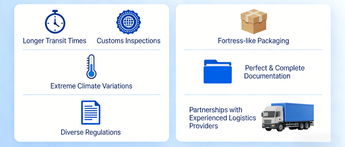 International shipping adds significant complexity: longer transit times, customs inspections, extreme climate variations, and diverse regulations. Success here requires meticulous preparation and the right partners.