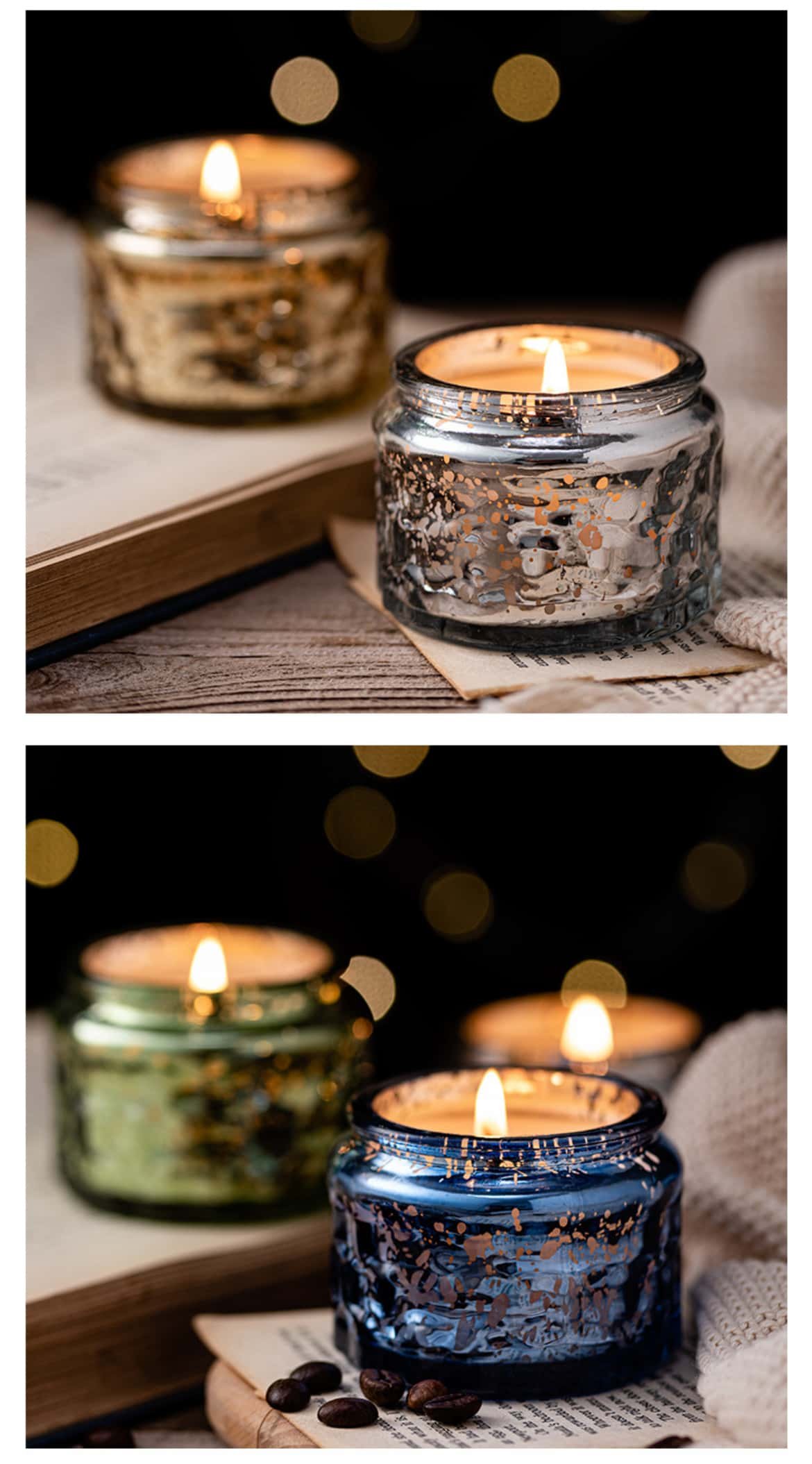 We present this Festive scented candle, inspired by the northern lights. The starry vessel blends vibrant base colors with shimmering glitter flakes. When candlelight hits the surface, it creates dancing light spots, mimicking the ethereal movement of an aurora. Choose from six high-saturation colors—gold, silver, pink, red, green, and blue—each a concentrated burst of celebratory light that instantly electrifies any space with festive magic.