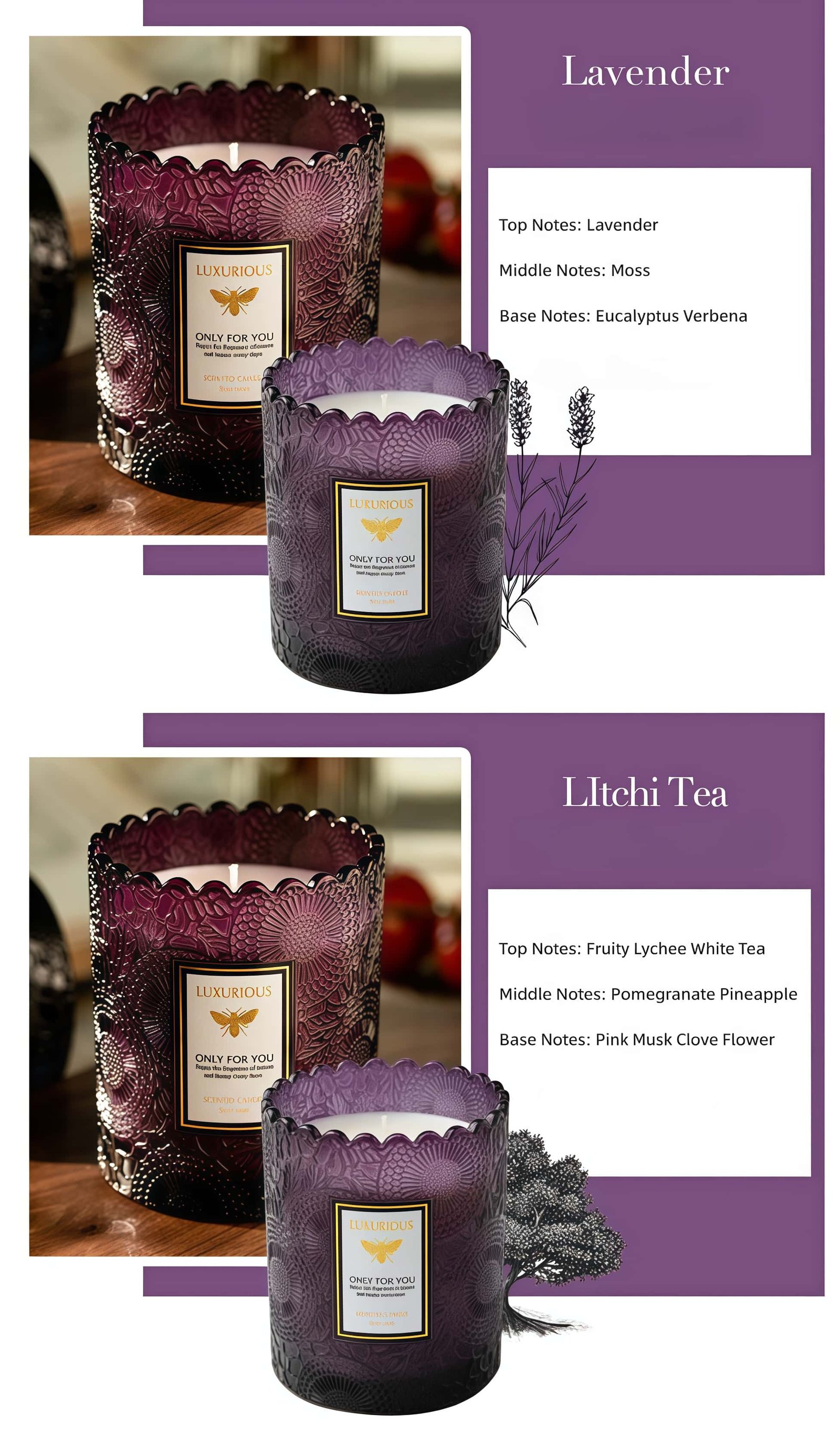 We present this Luxury scented candle, housed in a vessel adorned with intricate lace-inspired embossing. The interplay of light and shadow across the raised patterns creates a timeless, elegant aesthetic. Available in six rich glaze colors—white, grey, pink, crimson, amber, and purple—each cup shimmers like a jewel. Even unlit, it stands as a collectible art piece, elevating any vanity or mantelpiece with its sophisticated presence.
