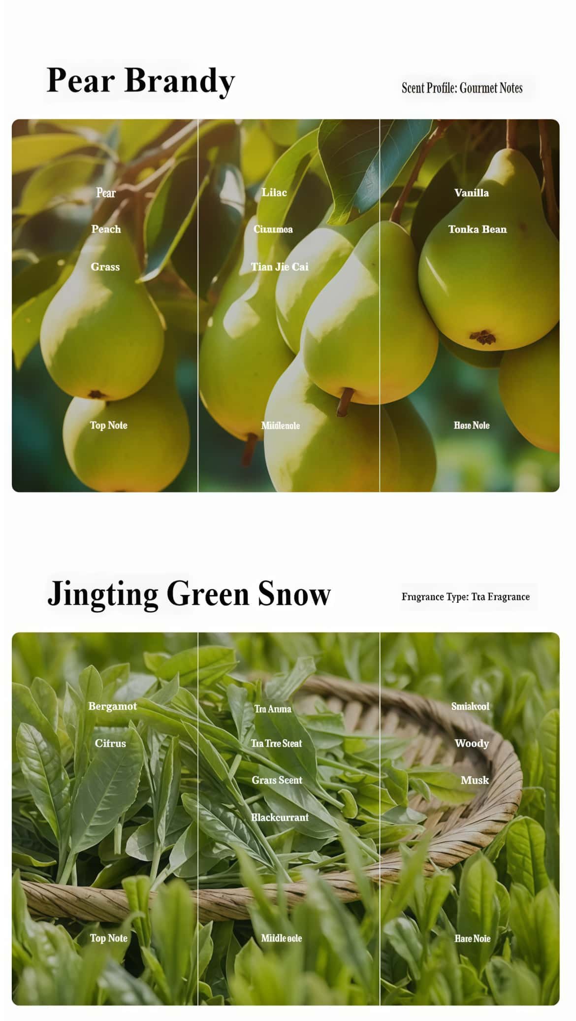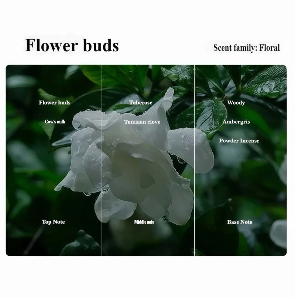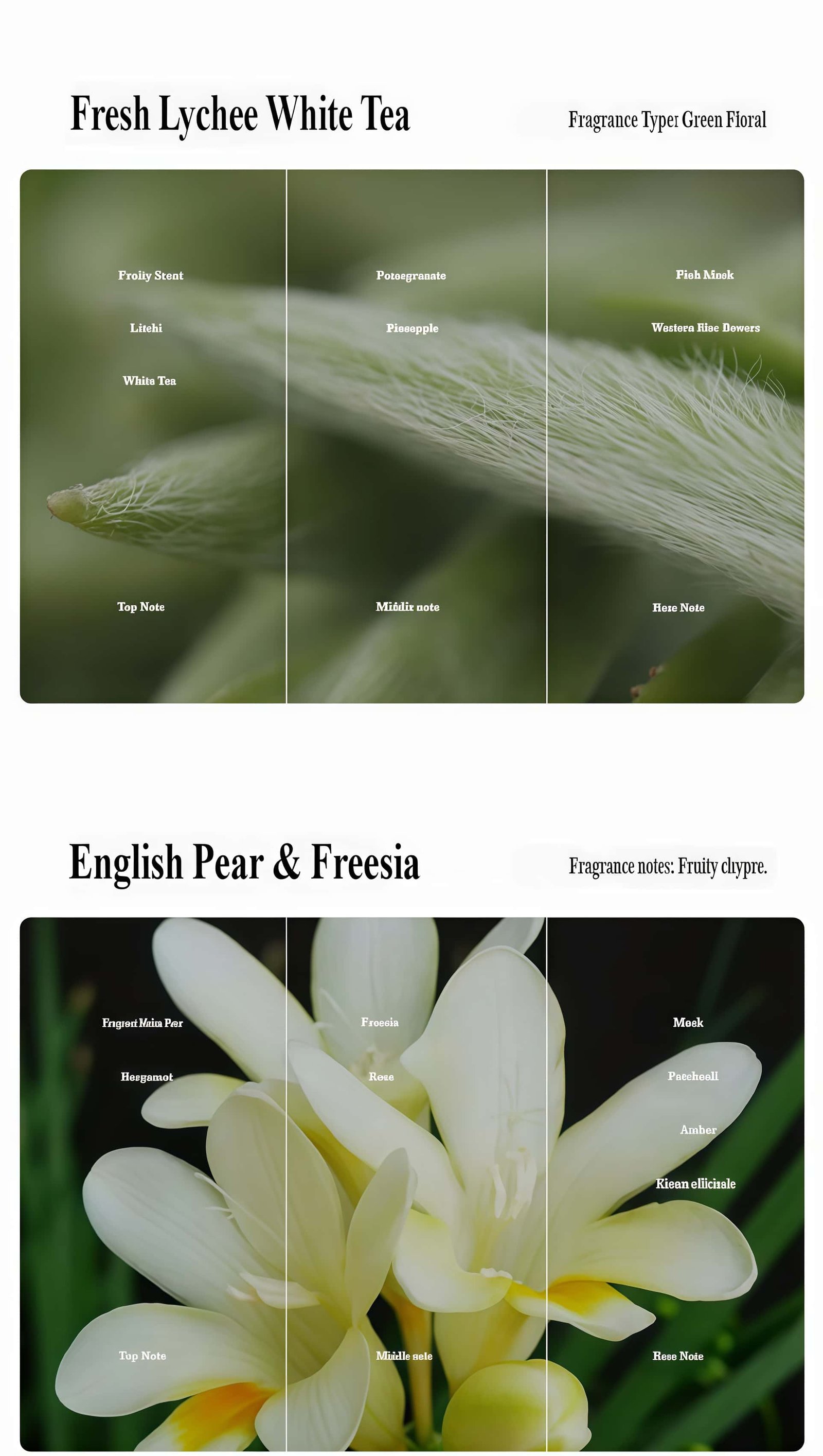 “Elegant Flora.” It awakens a natural spirit.Green tea, peach, and osmanthus. Peaceful yet vibrant.